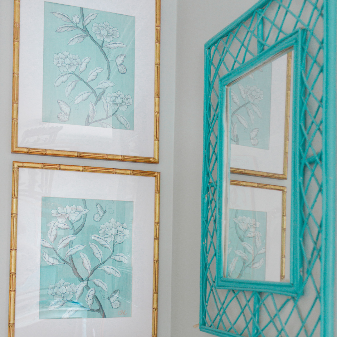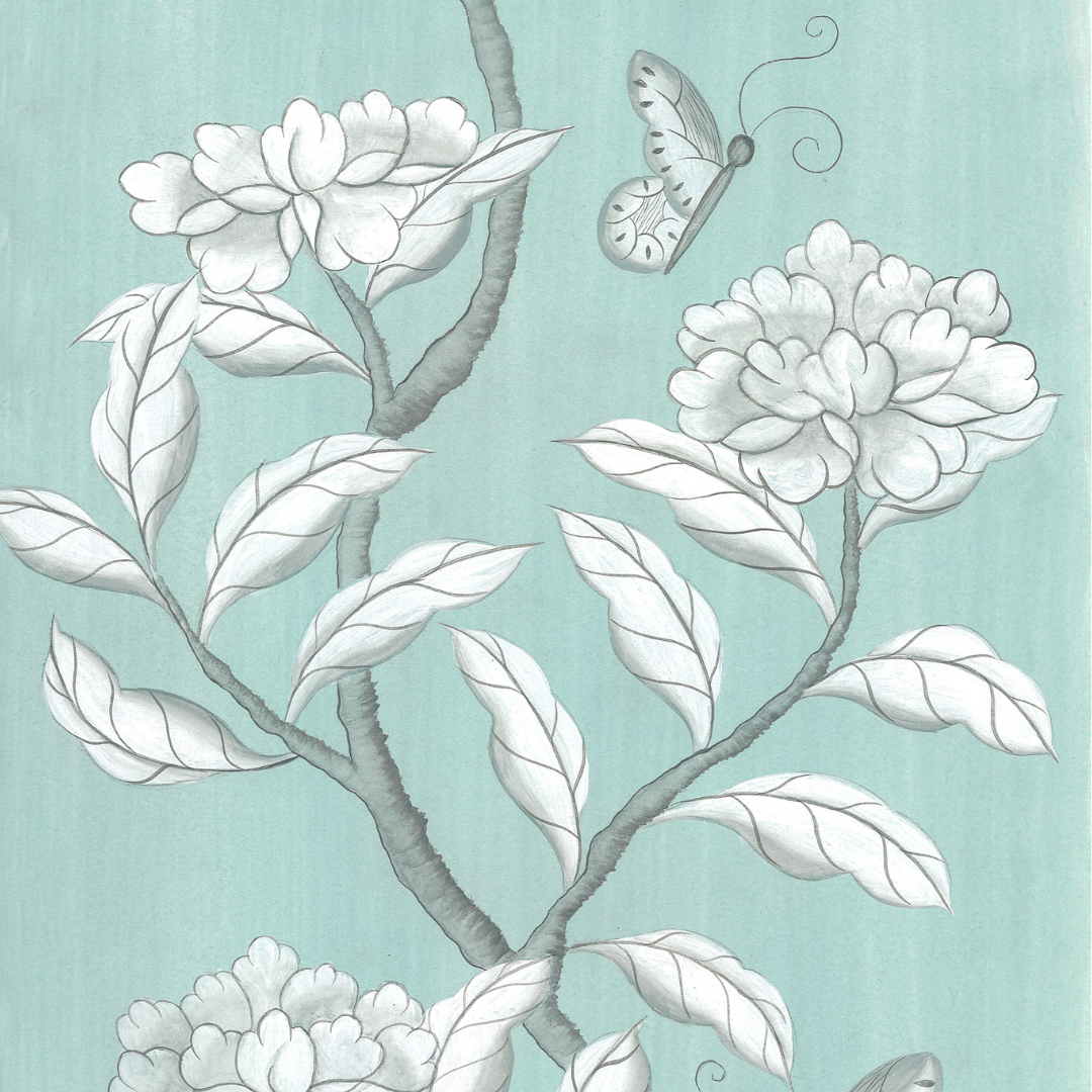 Bing the outside in with "La Mer" (the Sea) originals on papier. This whimsical array of white chinoiserie on blue/green was inspired by the beauty of a recent trip to Seaside, Florida. The ocean water in 30A is somehow transparent, turquoise, even glassy - it's so perfect. La Mer was inspired by the blues of the water and greens of the palm trees, making the perfect blue green tone.